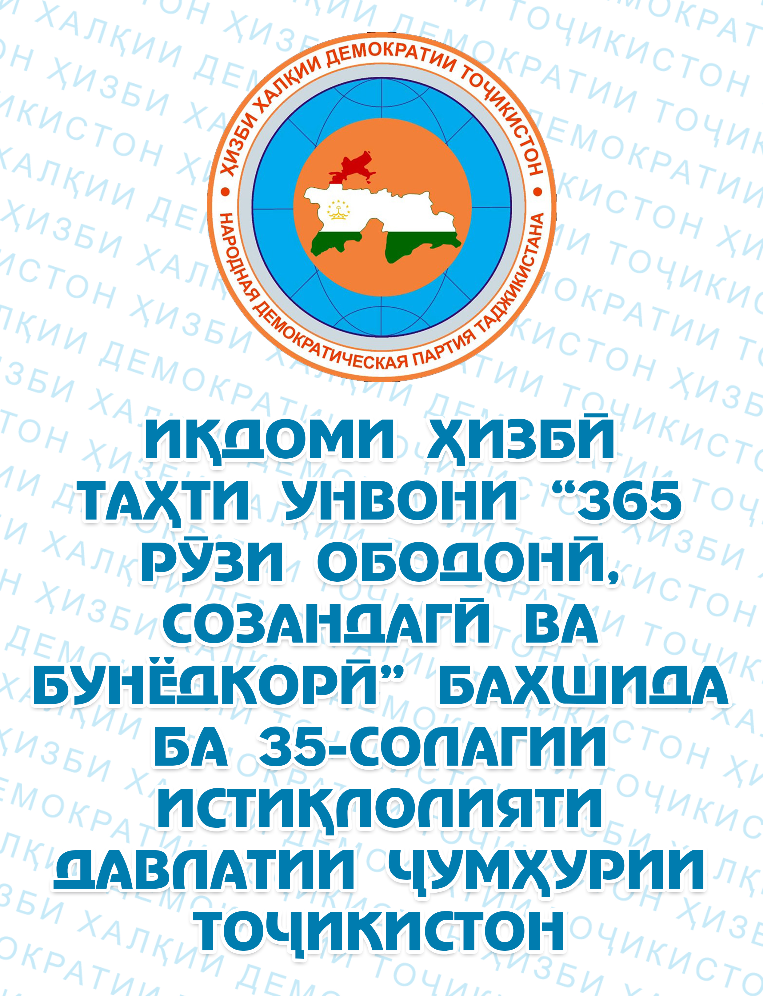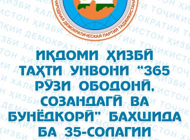 ИҚДОМИ ҲИЗБӢ ТАҲТИ УНВОНИ “365 РӮЗИ ОБОДОНӢ, СОЗАНДАГӢ ВА БУНЁДКОРӢ” БАХШИДА БА 35-СОЛАГИИ ИСТИҚЛОЛИЯТИ ДАВЛАТИИ ҶУМҲУРИИ ТОҶИКИСТОН